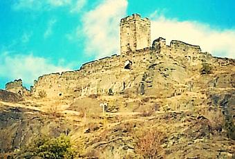 Nous atteignons en quelques foulées le château de Mont Jovet, qui domine la vallée. C'était un des points stratégiques du Val d'Aoste car à cet endroit les rives de la rivière, qui décrit un virage, se resserrent. Le site est majestueux. Quelques clichés plus tard je dévale vers le petit village en contre bas. Les kilomètres s'enchaînent vite et l'étape est courte. Comme le Val d'Aoste s'est bien impliqué dans l'accueil, Stefano a prévu des étapes courtes qui nous permettent quelques visites. Les 35 kilomètres du jour seront donc également touristiques.