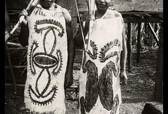 Photo 1 : Two Komba wearing barkcloth, New Guinea, Finisterre-Saruwaged-Range Baryta print 11.5 cm x 8.5 cm, RJM - Historical Photo Archives, Inv.Nr. 19031 Photo: Carl August Schmitz, © Historical Photo Archives/Rautenstrauch-Joest Museum.