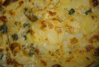 4) Mélanger la crème, le lait, l'ail haché, le persil haché, la moutarde, le sel, le poivre et la muscade. Verser ce mélange sur les pommes de terre.