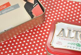 Avec une chute de fabric sticker (Daily Like de Toga sur majoliepapeterie.com) et une boite en métal de bonbons pour la gorge, j'ai recouvert le couvercle, l'intérieur et le dessous...