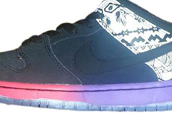 Les sneakers ont un upper noir en nubuck contrasté par un motif tribal réfléchissant et une semelle intermédiaire violette et rose avec une semelle extérieure translucide.