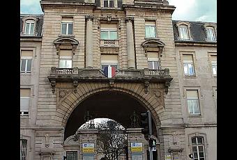 Voici un résumé succinct de l'historique de ce portail :La décision de la construction du nouvel Hôpital Civil avenue de Strasbourg (ex rue du Faubourg Saint-Pierre, la portion entre la place des Vosges et l'église Saint-Pierre a été rebaptisée Avenue du Maréchal de Lattre de Tassigny) est prise en 1877. Le projet est confié à Prosper Morey, architecte de la Ville qui doit respecter un cahier des charges précis : nombre de lits, chapelle...). Les premiers bâtiments datent de 1883.