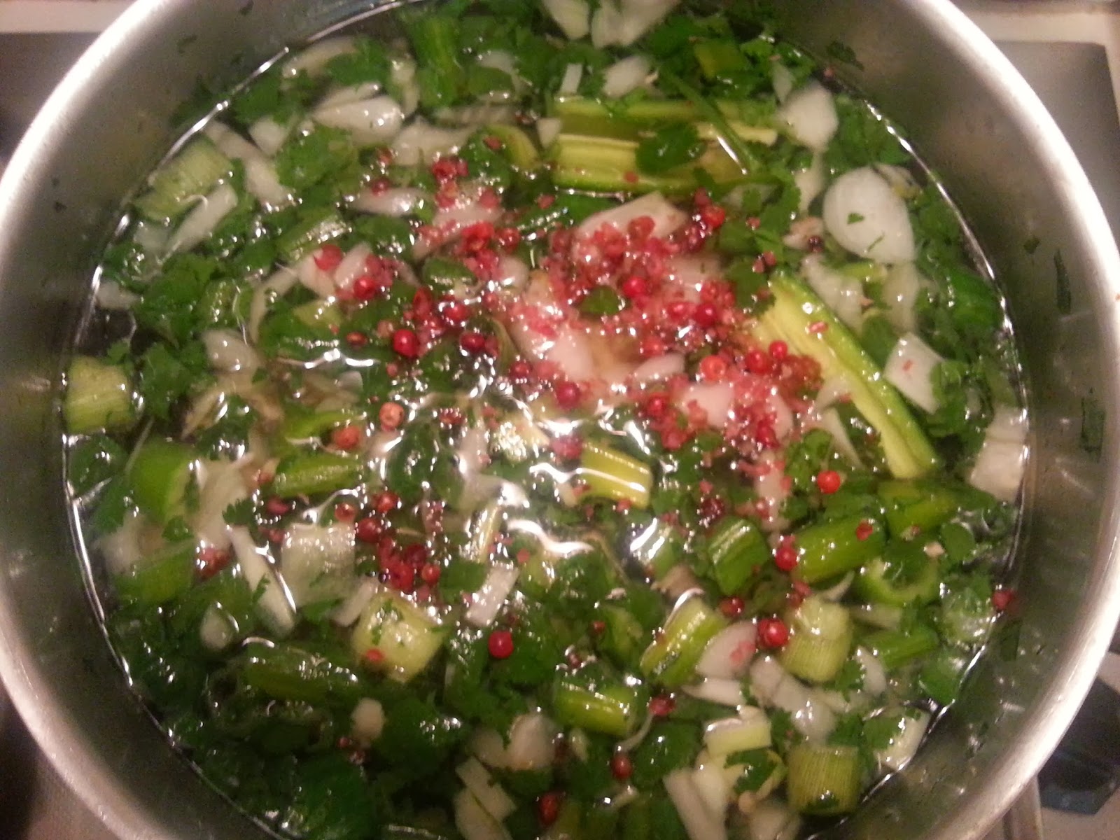 1ere étape : Verser de l'eau dans une casserole, y incorporer les os du poulet ainsi que sa peau détaillée, les oignons coupés en dés, le piment, le fenouil, les baies rouges, le zeste de citron.