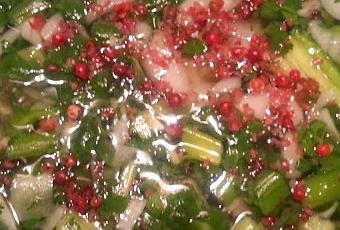 Ingrédients : un poulet, un piment fort, des oignons blancs, des baies rouges, 1 citron vert, de la coriandre fraîche, et des vapeurs (moi je les ai choisies chez Picard, à la crevette).