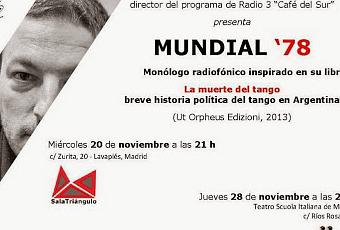 Pour l'occasion, il présentera mercredi 20 novembre 2013, à 21h, et mercredi 28, à 20h, dans deux lieux différents de la capitale espagnole, un monologue intitulé Mundial 78, inspiré de son livre publié cette année sur la Mort du tango, Brève histoire politique du tango en Argentine...