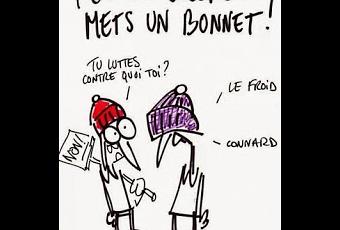 Bonjour aux zotresMes salutations vous proposent quelques pistes de réflexion pour lutter contre le froid. En voici deux autres en images. Je qualifierais la première de "stratégie pragmatique" tant il vaut mieux un bonnet violet qu'un beau nez rouge ! et la seconde de "voie de la vache sacrée".
