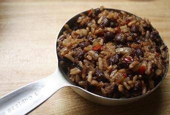 - Mettre une quantité égale de riz cuit et de haricots noirs.