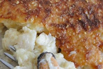 Dans un plat à gratin légèrement margariné, disposer les fruits de mer, verser la préparation dessus et parsemer de râpé ... perso, j'ai ajouté de la chapelure.