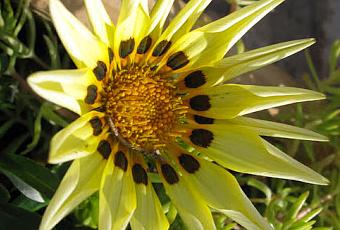 La Gazanie raide (Gazania rigens) est une Astéracée vivace des régions méditerranéennes, annuelle dans les régions plus froides, utilisée pour l'ornementation.Feuilles toutes basales, nombreuses, étroites et plus ou moins découpées. Fleurs jaune à rouge orangé, aux ligules habituellement marquées d'une tache noire à la base.