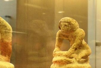 En vue d'accroître le corpus des petits monuments que j'avais alors évoqués quelques semaines durant, - les maquettes de scènes de labour, de greniers, les statuettes de bovidés -, je voudrais ce matin, partir à la rencontre de trois figurines que vous apercevez de quelque côté que vous vous placiez, posées les unes derrière les autres au sommet du panneau intérieur scindant véritablement en deux parties distinctes la vitrine 6 de la salle 5 du Département des Antiquités égyptiennes du Musée du Louvre.