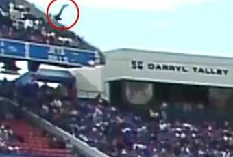 Lors d’un match des Buffalo Bills au Ralph Wilson Stadium, une scène surréaliste a été filmée par les caméras de télévision. Un supporter ivre a glissé sur la rambarde pour s’amuser mais il a atterri au niveau de la tribune inférieure, une dizaines de mètres plus bas. Dans le choc, l’homme a été blessé à l’épaule et la personne sur laquelle il est retombée, à la tête. Les deux ont été emmenées à l’hôpital…