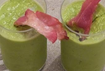 Versez le velouté dans les verrines et plongez-y une lamelle de lard croustillant. Servez aussitôt.