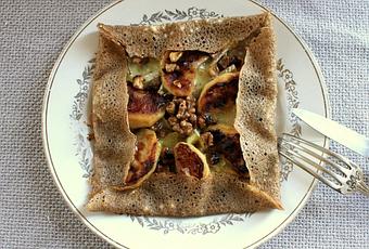 - Dans une grande poêle, faire fondre une noisette de beurre. Y déposer la galette de blé noir, côté plus foncé contre la poêle. Etaler la crème, poivrer, disposer les lamelles de Brie, les pommes et les noix.