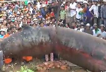 Il y a quelques jours, un animal insolite d’une dizaine de mètres de long et de plusieurs centaines de kilos a été découvert au Vietnam. Cette créature serait d’origine marine étant donné qu’elle possède une nageoire mais aucune certitude, certains pensent à un vers géant. C’est la première fois qu’un tel animal est trouvé…