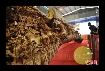 Un grand oeuvre artistique sur bois illustrant la célèbre peinture ancienne « Scène au bord de la rivière lors de la Fête Qingming » réalisé sur un tronc d’arbre de 12 mètres de long, 286, 3 mètres de haut et 2 mètre 40 de large.
