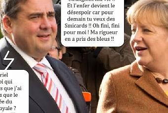 Et oui, on aura compris : Angela accepte contre mauvaise fortune bon cœur ! Il lui manque 5 sièges pour avoir la majorité au Bundesbank alors elle doit négocier avec ses rivaux (le SPD), gauchistes comme pas un, pour obtenir une coalition gouvernementale ! Quitte à avaler son chapeau qu’elle ne porte jamais d’ailleurs pour ne pas ressembler à l’octogénaire britannique !
