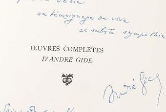 Le 9 décembre, des souvenirs de Maurice Chevalier seront dispersés à l'Hôtel Drouot. Ils proviennent de sa maison de Marnes-la-Coquette que Le Figaro a pu visiter. Dans la bibliothèque, les Œuvres complètes d'André Gide avec un envoi au chanteur :