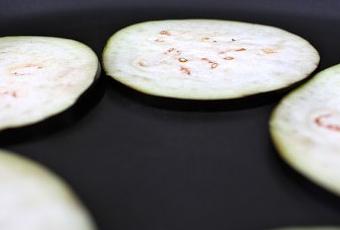 - Placez les rondelles d’aubergines sur la poêle à feu fort avec un filet d’huile d’olive avec du sel. Laissez cuire jusqu’à ce que les 2 côtés soient dorés (environ 10-15 minutes)