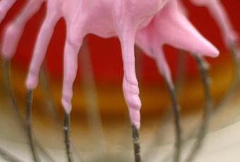 - quand le sirop atteint 118°, versez le en filet sur les blancs d’oeufs montés en neige, tout en continuant à fouetter. Versez le sucre sur le côté et pas sur le fouet du batteur sous peine d’éclabousser ou de vous brûler.