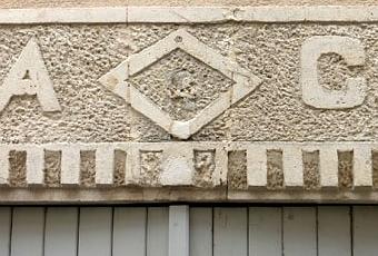 Le tailleur de pierre a dessiné ses motifs sur la surface bien plane des pierres de calcaire dur, puis il a bûché le reste à la pointerolle et à la massette (que les techniciens me reprennent si je commets des erreurs). Apparaissent donc, sur un linteau : deux rosaces ou fleurs à six pétales dans un cercle et les initiales A C de part et d'autre d'un losange central. Sur un autre linteau, sont représentées des volutes et, sur le claveau central, un écu enfermant un compas et une équerre, accompagné des lettres F V.