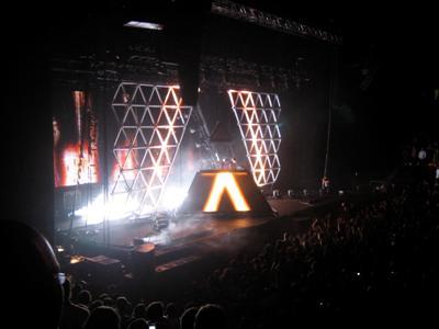 Bien plus que de venir écouter de la musique, Daft Punk en concert, c'est avant tout un gros show à l'américaine avec sons et lumières mis en scène. Ils arrivent bien sûr masqués comme à l'habitude, dans une pyramide qui va s'ouvrir pour les dévoiler en tenue de spationautes. Au départ seuls les contours de la pyramide vont s'éclairer pour accompagner la musique, puis ce seront les panneaux composés de triangles, puis l'intérieur de la pyramide, puis le fond de la scène et enfin l'intérieur des pyramides diffusera des images bien plus complexes que les simples formes géométriques qui y défilaient jusqu'à présent (visages de personnes, végétaux, ... représentant la planète) et les habituels projecteurs évidemment.