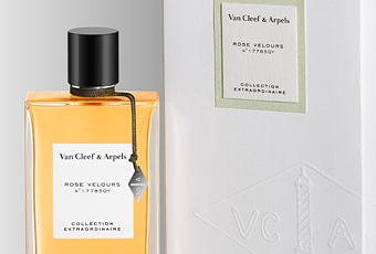 Van cleef & Arpels a imaginé cette Rose Velours comme nouveau parfum dans sa Collection Extraordinaire, protégé par l’épure d’un flacon d’un verre transparent, protecteur farouche d’une fragrance d’exception. Le tintinnabule de l’emblème finement lié au flacon, annonce d’ une délicate manière sonore, la présence de cette reine du parfum.