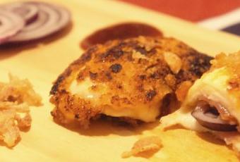 Passez vos croûtons au mixeur pour réaliser une fine chapelure puis disposez les dans une assiette. Dans un second récipient, disposez la sauce barbecue. Coupez de petits rectangles de mozza, ajoutez une fine lamelle de bacon et d’oignon rouge entre 2 tranches, refermez et passez à la poêle chaude quelques seconde de chaque côté juste le temps que votre mozza fonde un peu. Attentez quelle refroidisse puis passez la dans la sauce barbecue puis dans la chapelure. Ajoutez un gros filet d’huile pimenté dans une poêle chaude et passez quelques secondes de chaque côté à feu vif ! Servir chaud et foooondant !