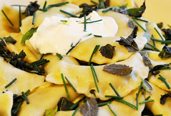 Servez les pelmenis avec une cuillère de crème fraîche et un mélange d’herbes fraiches (persil, ciboule et aneth).