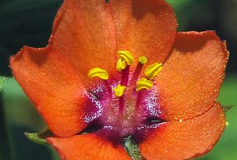 Le Mouron des champs rouge possède des pétales rouges se recouvrant sur les bords et les pédicelles floraux sont plus longs que les feuilles.