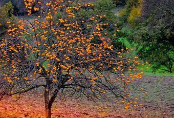 Appelé aussi « plaqueminier », le Kaki (diospyros kaki) est un arbre de la famille des Ebenacées originaire d'Extrême-Orient, dont certaines variétés atteignent 15m de hauteur (6 à 10m en moyenne). Ses fruits ressemblent à de grosses tomates d'un rouge tirant vers l'orange, dont la forme peut être ronde, conique ou cylindrique.
