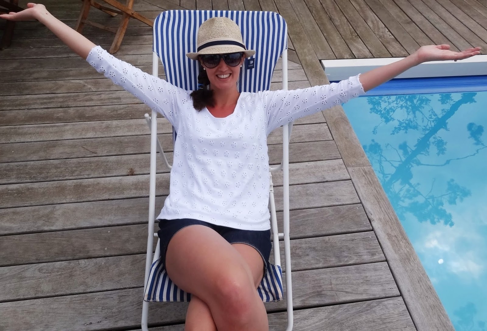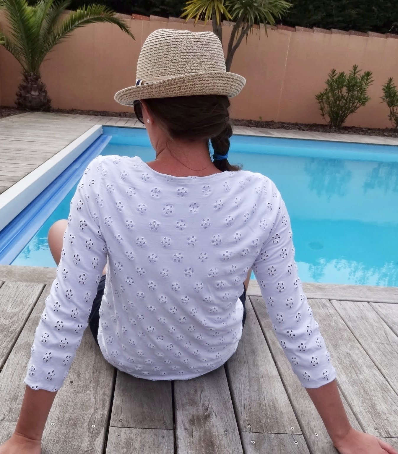 Comme d'habitude avec les patrons de Marie, aucune surprise, aucune difficulté, bon en même temps c'était pas la première fois que je le cousait. J'ai laissé les bords des manches et le bas à cru...en version flemme quoi! Résultat...la réalisation a du me prendre 1H30 café compris!Hummm on était bien au bord de cette piscine...