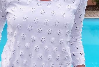 Le buste du tee-shirt est réalisé dans un jersey blanc avec broderies anglaises et doublé d'un jersey blanc uni. Bin oui sinon ça aurait fait un tee-shirt à trous! Et par contre je n'ai pas doublé les manches, car des trous sur les bras bin ça va c'est décent! Les deux tissus ont été achetés une bouchée de pain chez stop tissu à Belleville, vraie caverne d'Ali Baba pour celles qui aiment fouiller!