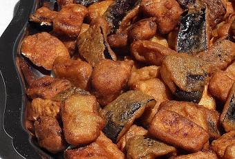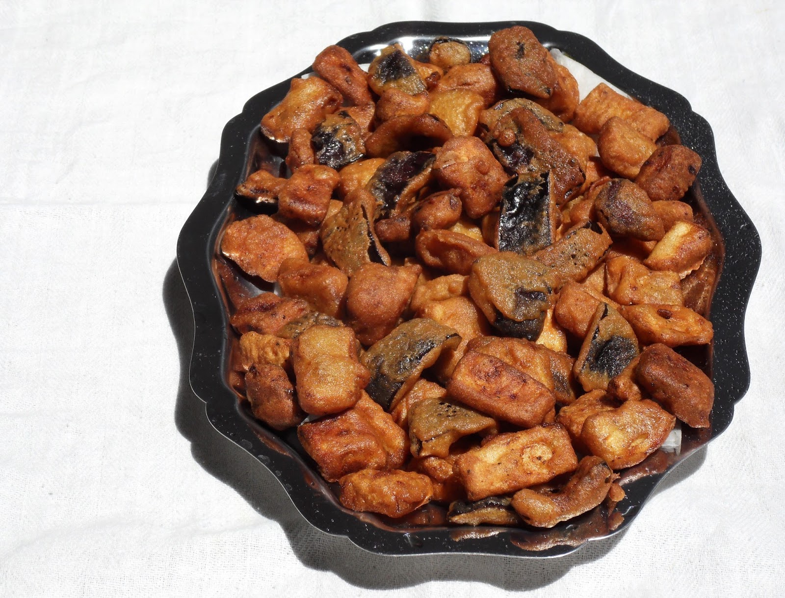 C’est une recette indienne des beignets d'aubergines (baingan pakora) que l’on peut servir comme amuse-gueule ou en accompagnement d’autres plats, végétariens ou pas. Ils sont végétaliens à 100% et sont naturellement sans gluten (sauf dans le cas où on remplace la farine de riz par de la farine de froment). Délicieusement épicés, ils sont croustillants à l’extérieur et moelleux à l’intérieur. En général, il faut couper les aubergines en tranches ou en demi-tranches, mais j’ai préféré détailler les miennes en dés de la taille d’une bouchée, plus sympathiques et plus goûteux.