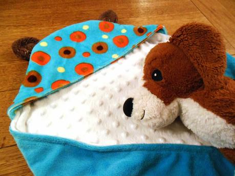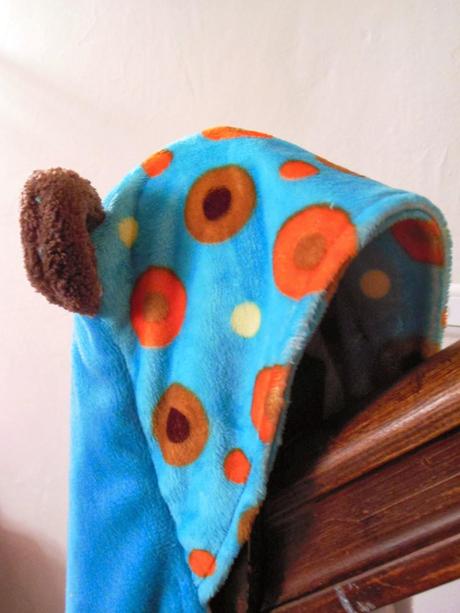 Les deux faces sont en minky blanc et bleu. La capuche également, mais avec des pois pour une petite touche de fantaisie. Et les oreilles sont en teddy... les oursons en peluche n'ont qu'à bien se tenir, bébé va leur piquer la vedette !