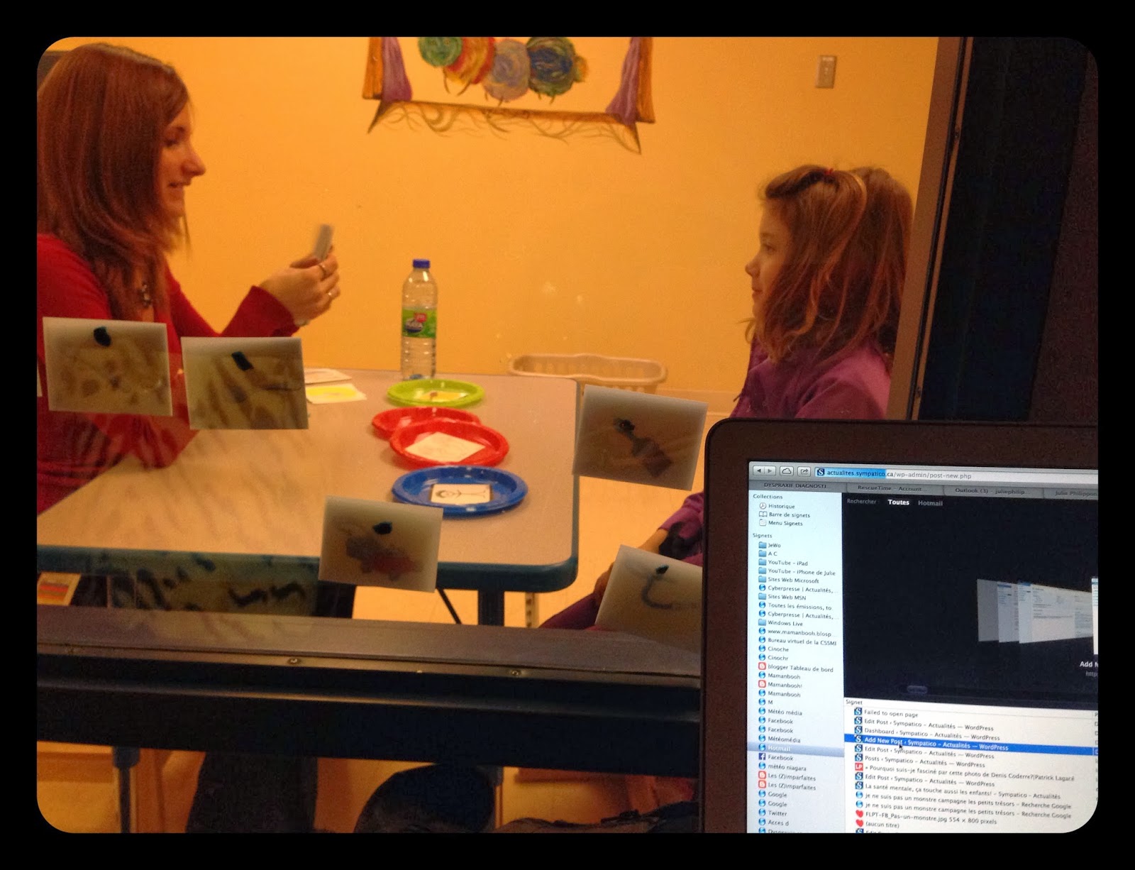 Je travaille pendant les thérapies de mes enfants, ici, avec Fillette en orthophonie, au centre de réadaptation.