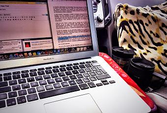 Je travaille dans mon auto entre deux rendez-vous, avec mon beau sac reçu lors du lancement de Véro!