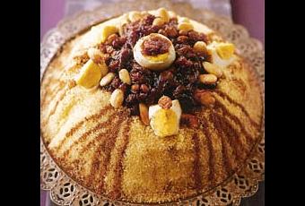 - Dans un grand plat, former une couronne avec le couscous et déposer au centre les morceaux de viande. Disposer les oignons et les raisins sur la viande. Mouiller avec un peu de bouillon. Parsemer d’amandes émondées et grillées. Verser le reste de bouillon dans un bol. Servir très chaud.