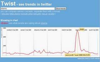 Faire une recherche sur Twitter et grâce à la fonction "see trends" vous pourrez voir les tendances sous forme de graphique et même l'incruster dans une page web.Vous pourrez par exemple comparer l'activité de microsoft, apple et ubuntu sur twitter.