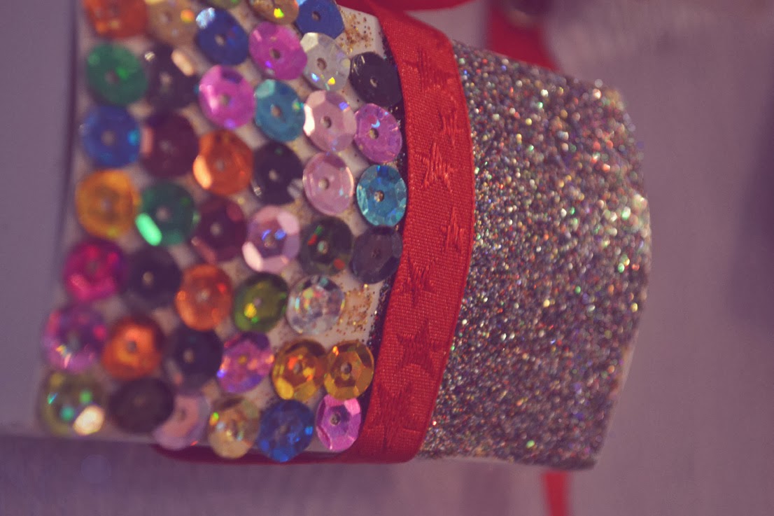Une fois que vous avez tout le matos, laissez parler votre créativité ou inspirez vous des modèles que j'ai fait. Pour coller les fines paillettes, j'utilise toujours la même technique qui marche bien car elle fait un relief et assure un résultat bien saturé en paillettes : j'applique une couche de peinture à paillettes (on en trouve dans tous les magasins de loisirs créatifs et même chez Gifi), puis je parsème généreusement de paillettes. Avec cette technique vous pouvez faire des pois, des bandes, des motifs.