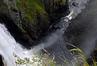 Voringfossen est une chute d’eau située dans la commune d’Eidfjord, dans le comté de Hordaland, en Norvège. La rivière Bjoreio y chute sur une hauteur toale de 183 m, dont un saut continu de 145 m. La rivière régulée pour la production électrique, mais le débit y est maximal en été avec 12 m3⋅s-1. La chute est l’attraction touristique gratuite la plus visitée de Norvège en 2007 avec 685 000 visiteurs. Source Wikipédia