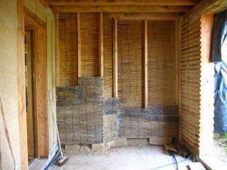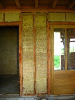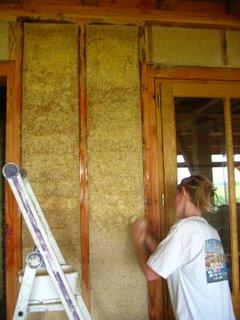 Jenny fait un test en grand de la finition - huile de lin - sur le chaux-chanvre.