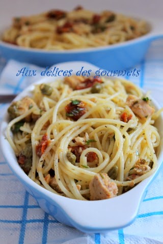 La forme et la texture des spaghettis et autres pâtes sont l'assurance d'un mariage réussi avec les poissons et fruits de mer. Dans cette recette express les spaghettis sont mélangés aux câpres, thon et tomates séchées le tout relevé avec un gout citronné. On peut aussi décliner cette recette avec d'autres poissons en conserve .