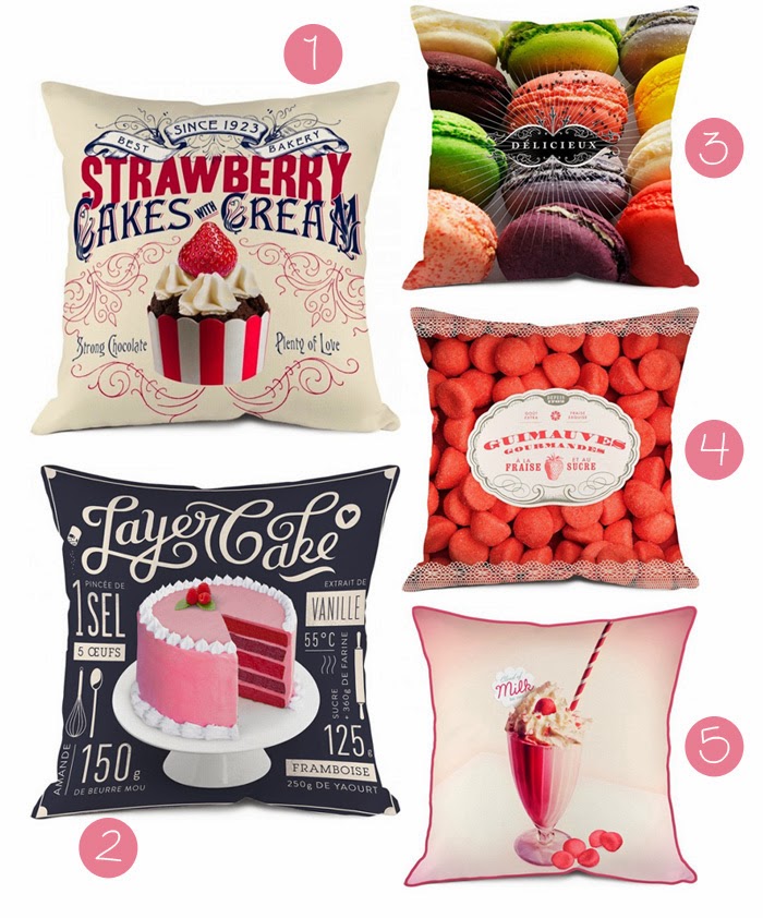 Ça fait teeeellement longtemps que je veux des coussins de la marque, mais il se trouve que ça n'allait pas avec la déco de mon salon, sauf que cette année je change tout hein hein ! 1 - Strawberry Cakes with Cream (élégant et gourmand)2 - Layer Cake (mon préféré)3 - Macarons4 - Les Fraises5 - Milkshake avec ses jolies couleurs