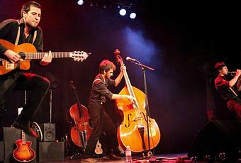 La contrebasse au milieu, une guitare de chaque côté, mais ça ne va pas être toujours comme ça : une trompette, un violoncelle de part et d’autre, mais aussi un cajon d’un côté ou une troisième guitare au milieu. Et puis ils jouent et chantent debout, assis, jamais de la même façon. Band à bretelles, la seule chose dont ils ne se déparent pas, c’est le sourire, qu’on entend d’ailleurs dans le ton de leurs voix. Trois voix qui alternent ou chantent à l’unisson ou même en canon. Ces trois-là aiment la musique et les mots, légers comme des plumes, dispersés comme des miettes, invitant à partager les rythmes, n’hésitant pas à se mêler au public qui en redemande, comme ils font dans le métro, car ce ne sont pas des musiciens chanteurs de salles, même s’ils y sont bien, ils ont posé leurs insomnies acoustiques dehors, et ils y sont sans doute encore très bien, au milieu, au plus près de nous.
