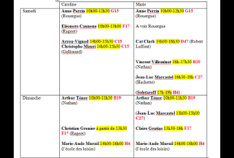 Puis est venue l’heure de la dédicace, genre quand Anne Percin est arrivée j’étais hyper heureuse (ben ouais eh ! Depuis le temps que je voulais la voir). Et ma petite soeur aussi, bien qu’elle l’ait déjà rencontré. En plus elle lui avait fait un super dessin, en rapport avec sa trilogie sur Maxime, et concernant surtout le personnage de Julius (mon chouchou d’amour), mais où elle avait inclu des personnages d’autres livres. Je vous montre son chef d’oeuvre (où Maëve, Caro et moi avions mis chacune un petit mot).