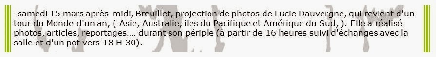 Samedi 15 mars 2014, à partir de 16h00à l'Auditorium de Breuillet (91)On y parlera "milieux naturels et humains" des 4 grandes "régions" visitées lors de ce [1er] tour du Monde :- Océan indien- Inde et Asie du sud-est- Océanie et îles du Pacifique- Amérique du sud