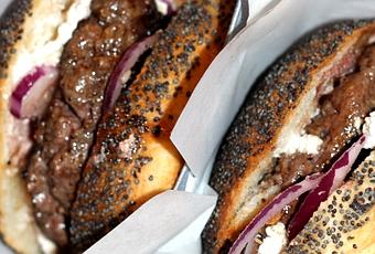 - Hamburger Westwood by Eat The Road : pain au pavot, ôte de boeuf, oignons rouges, roquette, ricotta et tomates )