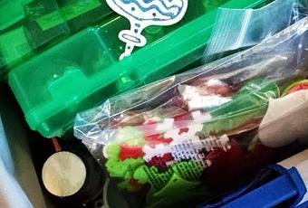Je garde une boîte métallique de Noël pas loin de la table, avec du matériel et les enfants puisent dedans pour bricoler.