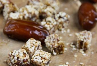 200 g de dattes120 g d'amandes effilées120 g de graines de sésame (dont 40 g pour la finition)150 g de miel solide (ou 120 g de miel et 30 g de sirop de malt d'orge)2 cuill. à soupe de sucre rapadura1 cuill. à soupe d'huile d'oliveune pincée de cardamome en poudre