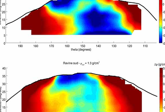 Un article du "Pour la Science" de décembre m'a particulièrement scotché : une équipe a radiographié, ou plus exactement tomographié l'intérieur du volcan de la Soufrière en Guadeloupe [1]. Le projet "Diaphane" du CNRS a obtenu des mesures de la densité des roches comme celles ci-dessous: